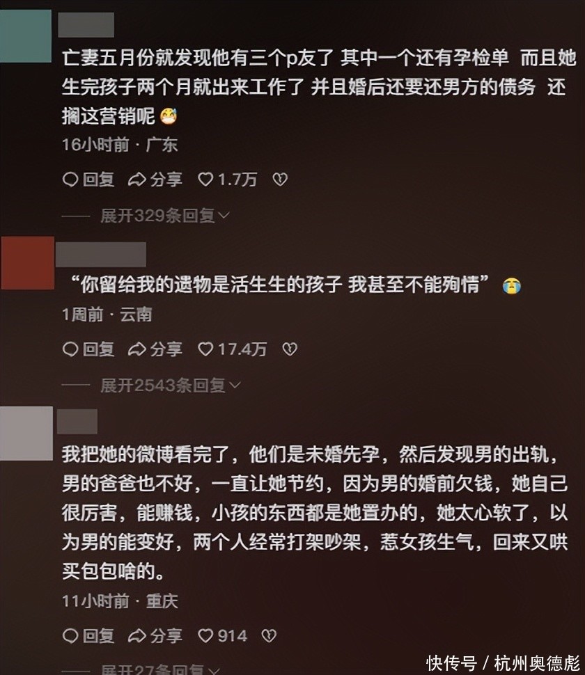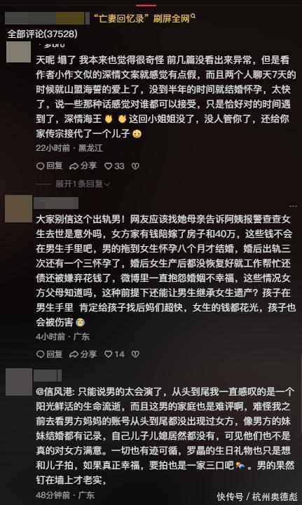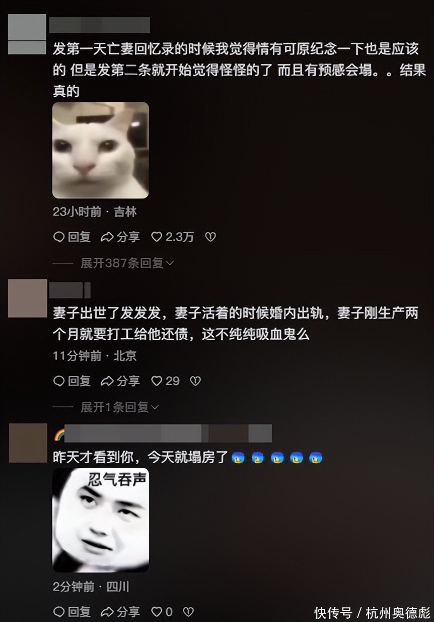 还有网友表示,发第一条亡妻回忆录的时候,我觉得情有可原纪念一下也是应该的,但是发第二条就开始觉得怪怪的了,而且有预感会塌,结果真的崩塌了。